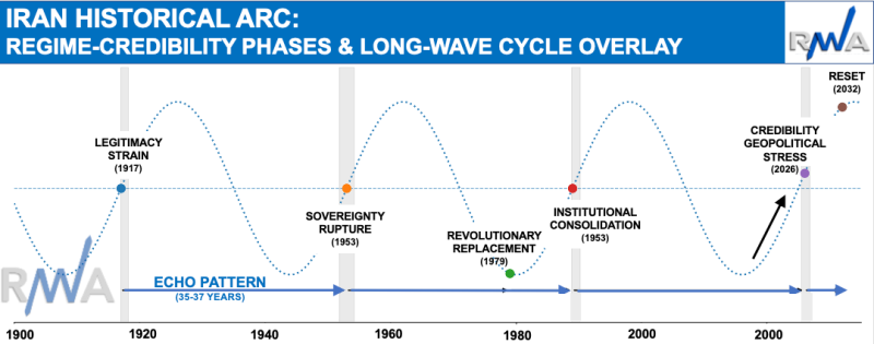 It is within this environment that Iran’s role becomes more consequential. Viewed across longer waves of institutional authority, Iran’s modern history shows a recurring cadence of erosion and consolidation: imperial decline in the early twentieth century, the sovereignty rupture of 1953, revolutionary replacement in 1979, and stabilisation after 1989. By comparison and cyclical pattern (approx 35-37 years), 2026 increasingly resembles another inflection window, where domestic strain and external confrontation begin to intersect (Figure 3).