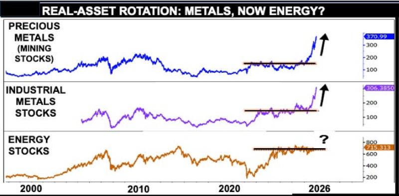 Today’s environment carries similar characteristics. Economic fragmentation, strategic competition, and domestic pressures are again interacting within a system whose institutional foundations are being questioned. Markets are responding accordingly. The earlier phase of late-cycle leadership from precious metals is now broadening toward energy, reflecting a transition from monetary anxiety to concerns about physical supply, security, and enforcement power (Figure 2). Such tools can influence political trajectories—as recently observed in Venezuela—but they also heighten the risk of miscalculation and transmit volatility directly into global commodity markets.