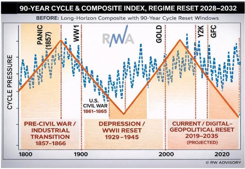 This backdrop fits within a broader super-macro cycle in which hegemonic systems periodically face tests of adaptability. Our expanded cycle framework places the present era in the late stages of a roughly 90-year crisis rhythm, with pressures likely to intensify into the 2026–2032 window as institutional credibility, alliance structures, and economic arrangements come under mounting strain (Figure 1, featured in our latest special macro report: Navigating the 2026 Cycle Convergence).